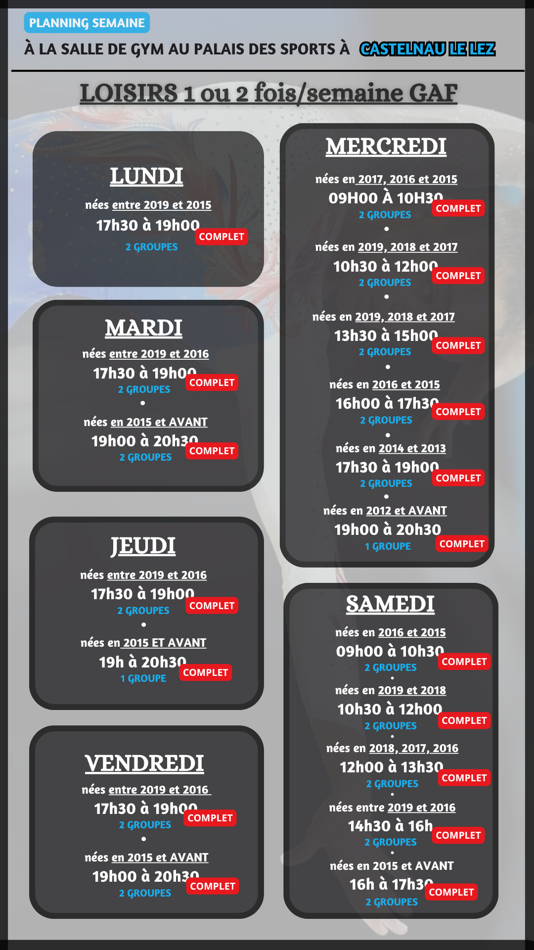 Tout au long de l’année vous pourrez vous inscrire dans les groupes où il reste encore des places disponibles. Vous avez droit à un cours d’essai gratuit ou 2 cours d’essai gratuits pour les moins de 5 ans.